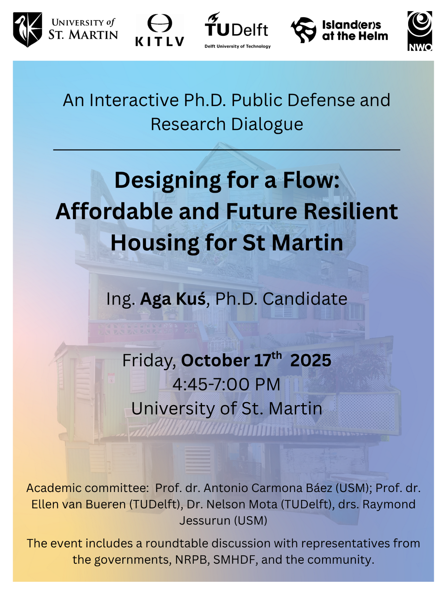 Following the defense, a roundtable discussion will be held with representatives from the Government of St. Maarten, the NRPB, SMHDF, and community stakeholders. The session will explore how academic research can inform future housing policies and climate resilience efforts on the island.