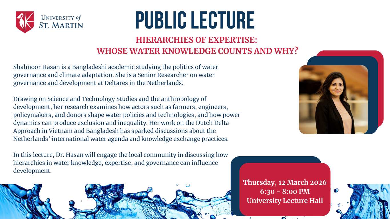 The University of St. Martin will host a public lecture titled “Hierarchies of Expertise: Whose Water Knowledge Counts and Why?” on Thursday, March 12, 2026, from 6:30 p.m. to 8:00 p.m. USM Lecture Hall 202.
